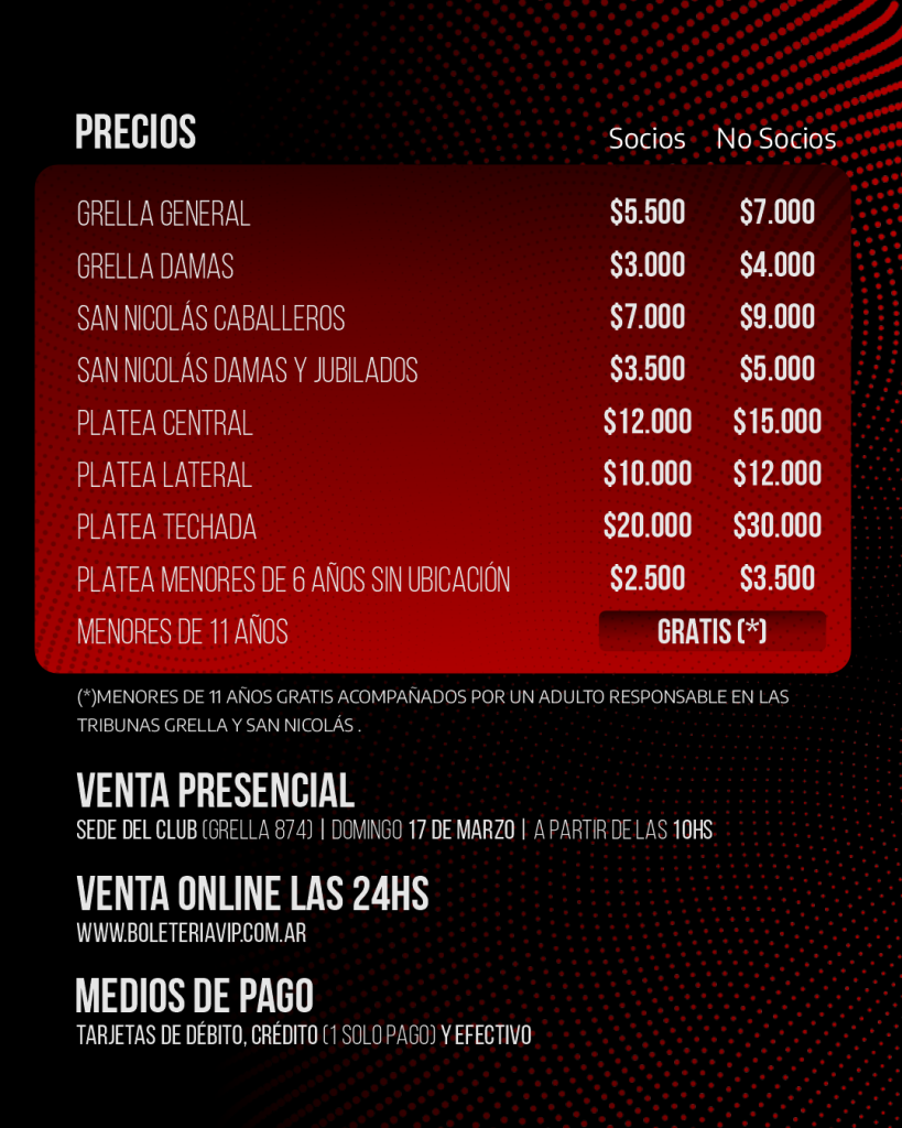 Venta presencial: domingo a partir de las 10hs tanto para socios como para no socios.